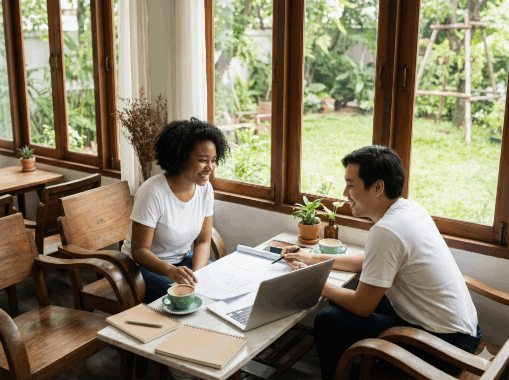 (カフェまたはオンラインで、理想の暮らしのイメージをお伺いします。)
