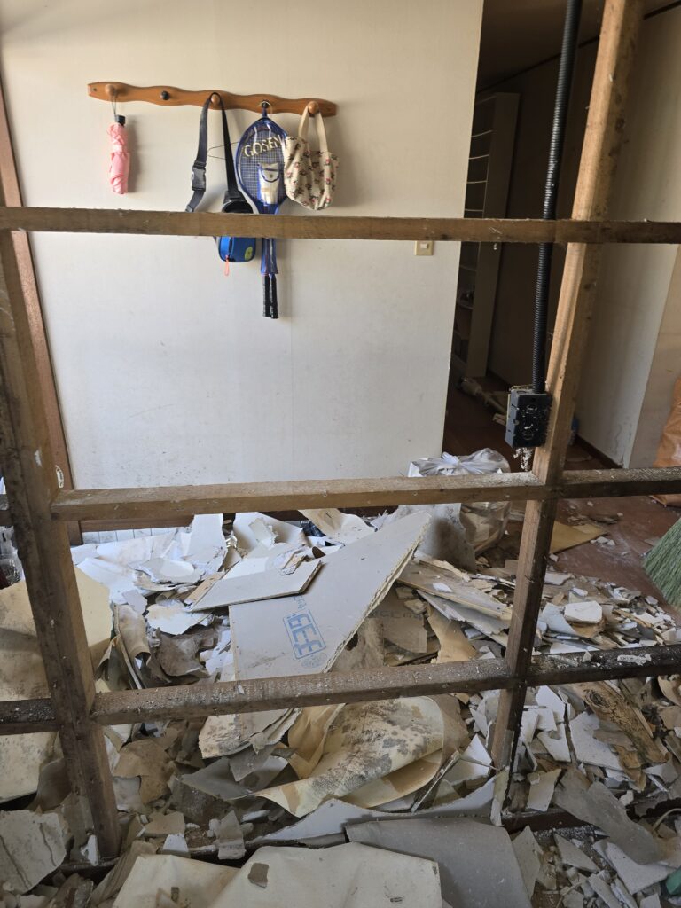 壁のボードが剥がされ、柱がむき出しになったその向こう。 壁掛けフックには、使い込まれたラケットとバッグ、そしてピンクの傘が、まだそのまま掛かっていたんです。