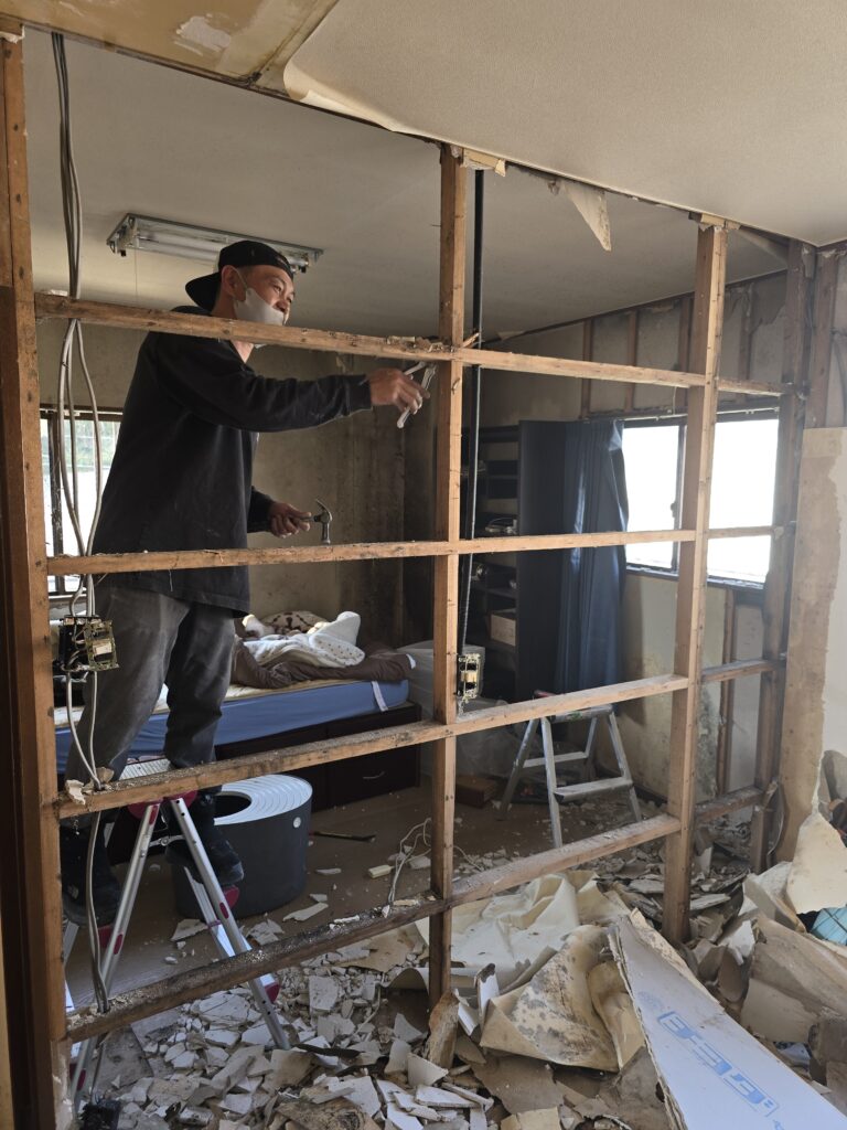 残すべき柱や、再利用できる下地を傷つけないように、バール一本で慎重に、かつ大胆に壁を「解体(ほど)」いていく。 まるでパズルを逆に辿っていくような繊細な作業です。